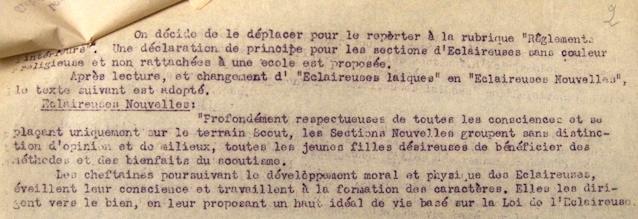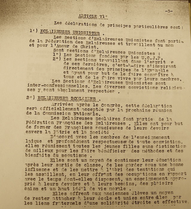 Intégrant, à la fois, les réflexions menées dans le cadre du Mouvement des Éclaireuses (Unionistes) en 1919 et 1920, et les exigences » des unités existant au foyer « ouvert » de Naples et à la Mouffe, les statuts de la future fédération font l’objet de plusieurs projets, pour aboutir à un document pour lequel nous avons trouvé deux rédactions que nous n’avons pu situer dans le temps, mais dont les différences ne mettent pas en cause l’esprit.