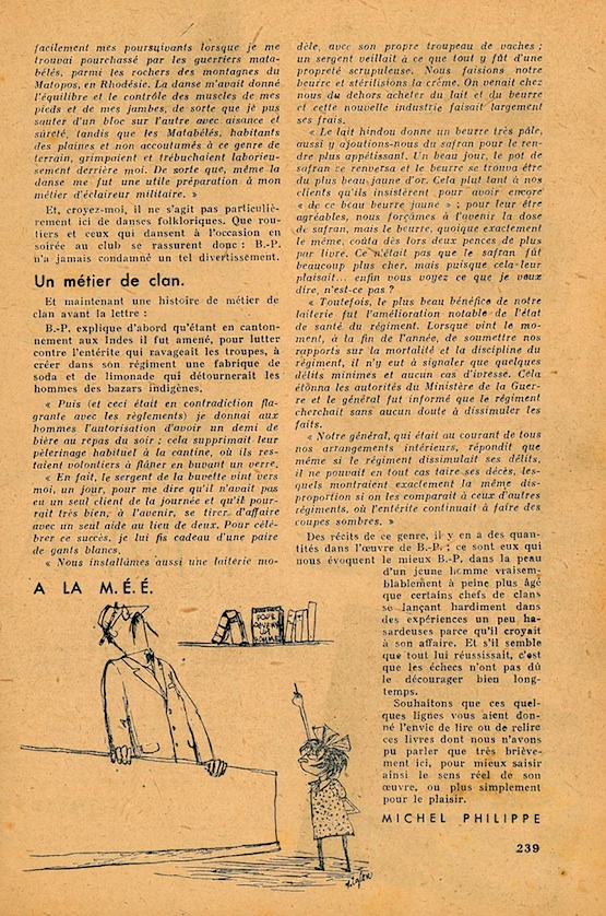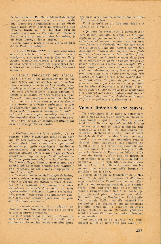 Après avoir, au passage, salué « telle honorable personnalité des milieux laïques » qui en dénature les apports, constate que B.P. est « un génial touche à tout » dont les écrits de base méritent d’être retrouvés et relus, même si la M.E.E. (la Maison de l’Éclaireur et de l’Éclaireuse, la Boutik de l’époque) ne les propose plus…