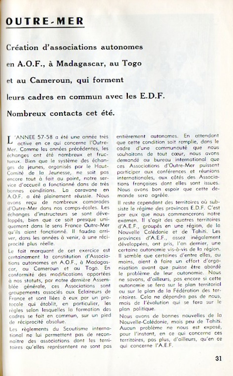 « Le Routier » puis « Routes Nouvelles » évoquent assez souvent le problème global de la décolonisation, avec des échanges plus spécifiques en ce qui concerne l’Algérie où la France est en guerre sans le reconnaître (impliquant de nombreux jeunes appelés « sous les drapeaux » pour le service militaire). Il est important de conserver avec ces Mouvements, nés de notre scoutisme, les meilleures relations possibles, par des échanges et des actions de formation en commun.