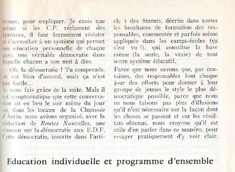 « Il n’est d’éducation qu’individuelle. Toutes les activités que l’on peut inventer dans un groupe de jeunes sont des moyens pour faire progresser un certain nombre de garçons et de filles et ces moyens perdent 80 % de leur efficacité si l’on se contente de faire marcher “ le groupe ” sans s’occuper de savoir comment chaque personnalité s’intéresse à ce qui est fait, en profite ou n’en profite pas. (…). La démocratie est une pédagogie, c’est-à-dire une série de moyens, pour amener garçons et filles à s’exprimer, à se former le jugement et le caractère, à respecter les autres. »
