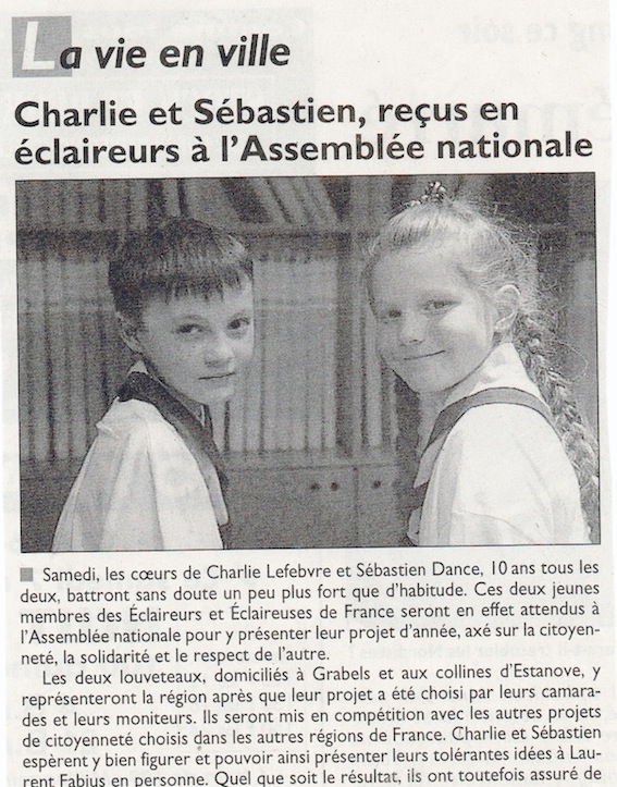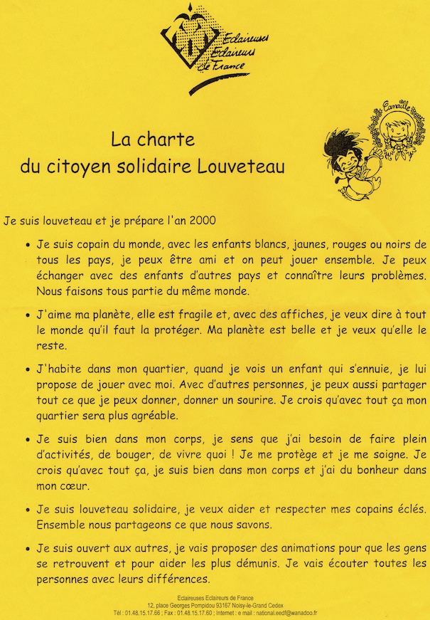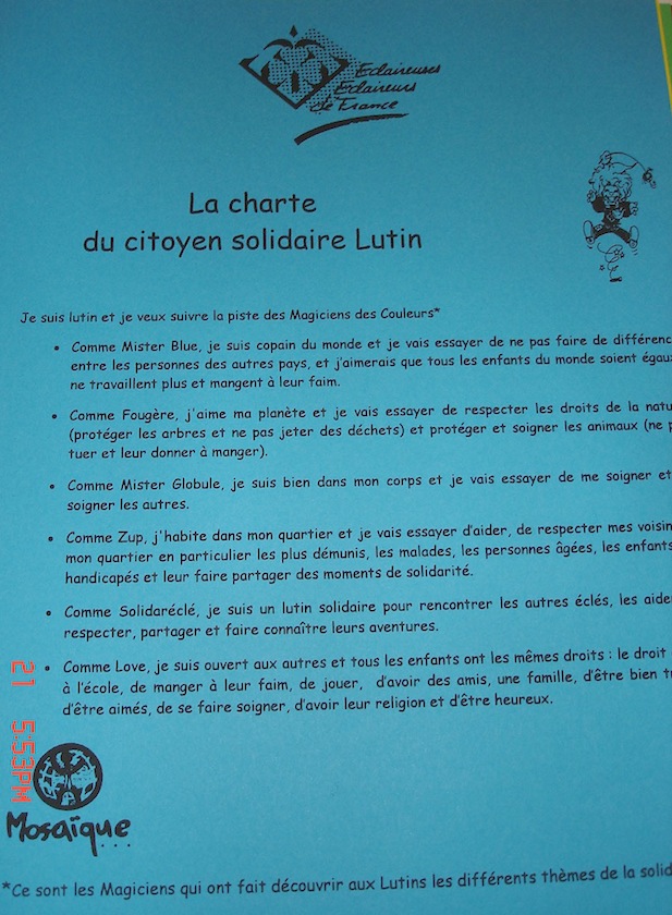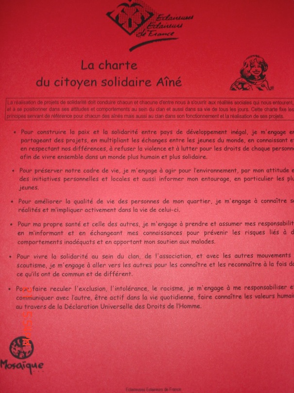 Aboutissement du projet Mosaïque, lutins, louveteaux, éclés, aînés… et quelques responsables se sont retrouvés à l’Assemblée Nationale pour élaborer quatre « chartes du citoyen solidaire » adaptées à leur âge, à partir de la mosaïque des 800 projets solidarité élaborés au cours des années précédentes. Des lutins aux aînés, chaque branche a sa démarche : par exemple, les lutins ont découpé leurs phrases préférées pour faire un texte par couleur avec l’aide des Magiciens des couleurs… Le dimanche après-midi, tout le monde s’est retrouvé à l’Assemblée pour présenter les chartes, préparées le matin et imprimées pendant le repas. Toutes ont été adoptées à l’unanimité moins quelques abstentions avant d’être envoyées aux quatre coins du pays et du monde…