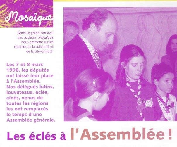 La veille, le président de l’Assemblée, Laurent Fabius, est venu saluer tous ces participants et a prononcé un discours dont voici un extrait : « Je suis de ceux qui admirent ce que vous avez entrepris et réalisé, et je remercie les militants des Éclaireuses & Éclaireurs de France d’avoir conçu et conduit ce projet. (…). L’un des accompagnements de la citoyenneté, c’est l’esprit de responsabilité. Ce qui m’a semblé remarquable dans l’opération Mosaïque, c’est justement qu’elle vise à développer l’esprit de responsabilité. Responsabilité dans le choix du projet, responsabilité dans la conduite de l’action : une telle démarche mérite d’être saluée… »