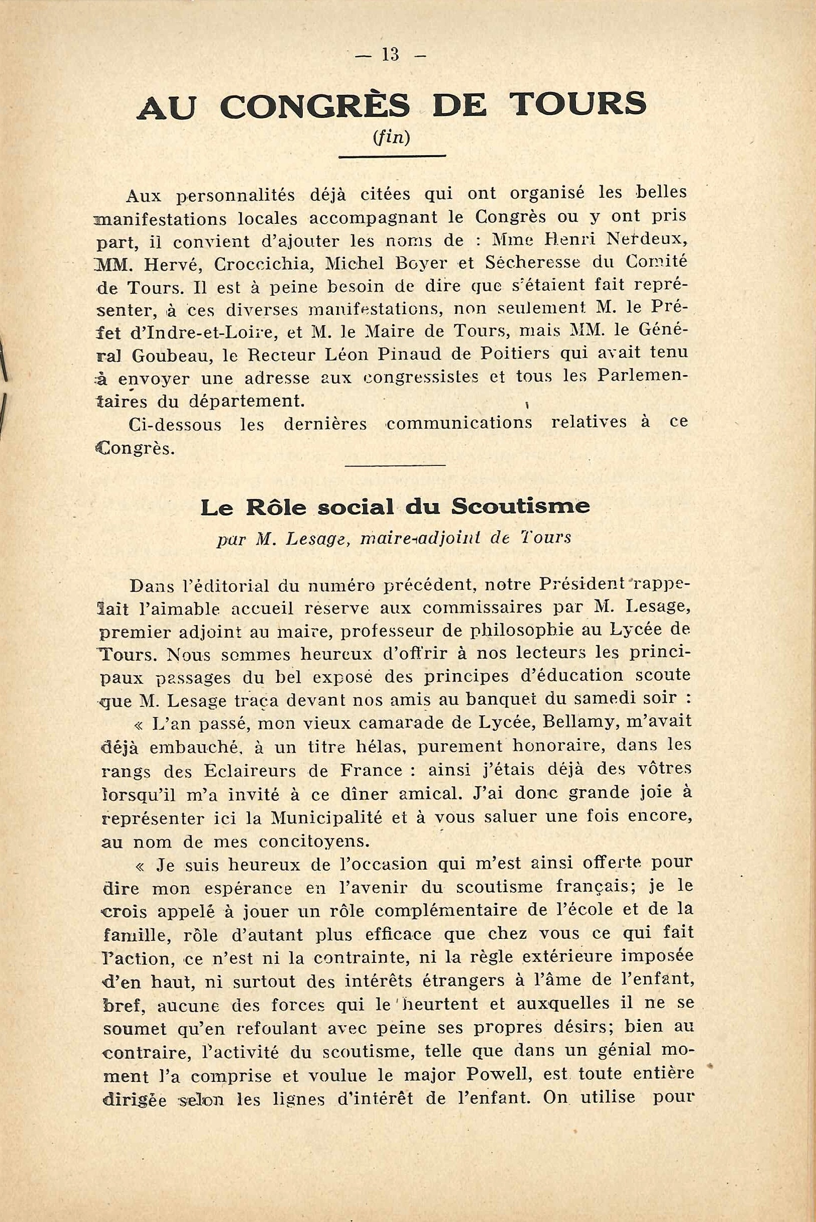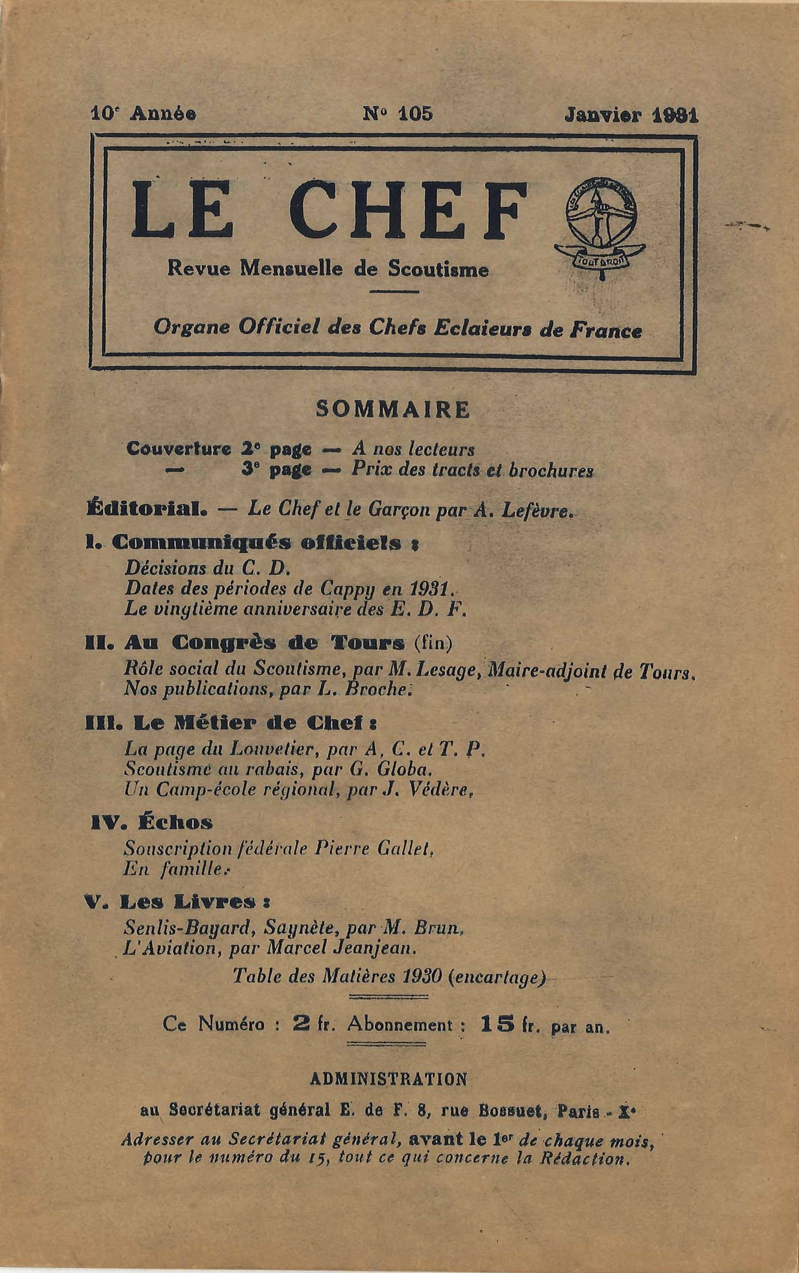 Le Chef de janvier 1931 présente un long article sur « le rôle social du scoutisme », à partir d’un exposé de M. Lesage, maire-adjoint de Tours à l’occasion du congrès qui s’est tenu dans cette ville : « … On ne saurait surestimer le rôle social du scoutisme dans nos démocraties qui ne peuvent vivre et prospérer que si elles savent élever les futurs citoyens dans les plus strictes vertus ». Avec un correctif important : « … à condition qu’il se dépouille de tout parti politique ou confessionnel, trop souvent ferments de désaccord, qui ne devraient avoir aucune place dans un système d’éducation morale ».