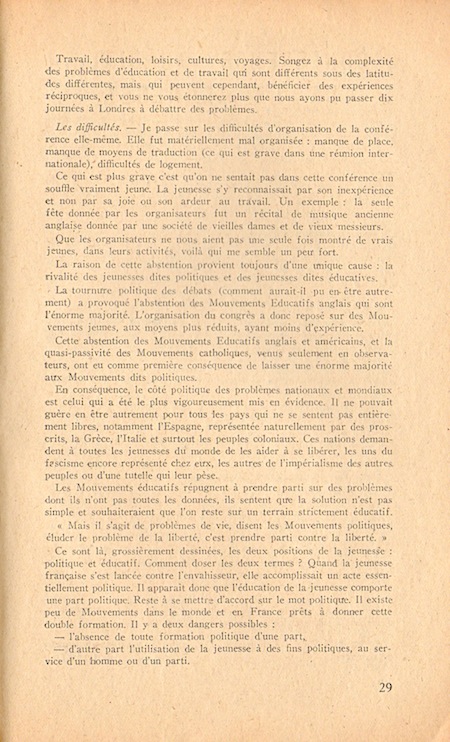 Fernand Bouteille, membre de l’équipe nationale « délégué » par Pierre François à la Conférence Mondiale de la Jeunesse en 1946, tire les conclusions de sa participation et met en évidence l’importance de ce qu’il appelle « le côté politique des problèmes nationaux et mondiaux » en l’absence des Mouvements éducatifs anglais et américains ou des associations catholiques. Sa conclusion est à double sens.