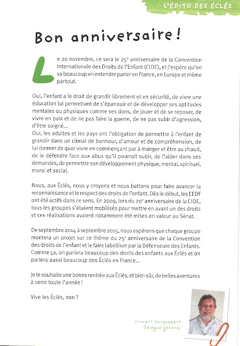 Une belle photo de couverture, un accueil par le délégué général qui présente le 25e anniversaire de la Convention Internationale des Droits de l’Enfant…