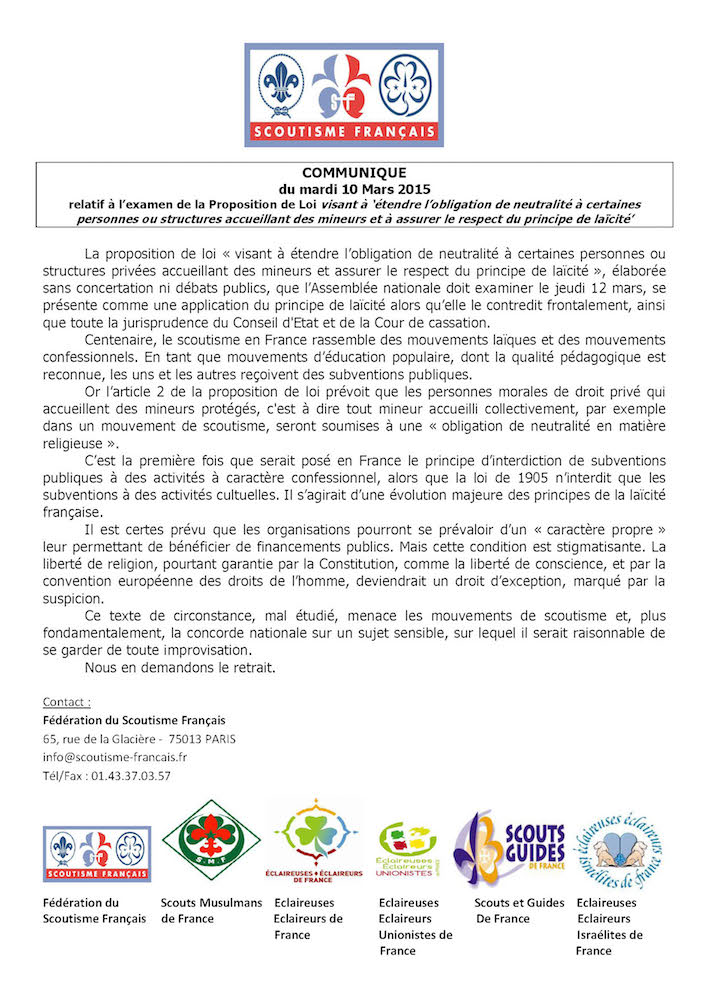 Notre laïcité, celle de notre Mouvement, est une composante – bien entendu importante – de celle de notre pays, à laquelle un projet de loi envisage d’apporter des modifications peut-être importantes. Le Scoutisme Français, fédérant les associations françaises de scoutisme membres de l’OMMS et AMGE (scoutisme mondial), a jugé utile de formuler une opinion sur ce texte. Il nous a semblé intéressant d’accompagner son communiqué de deux autres documents :