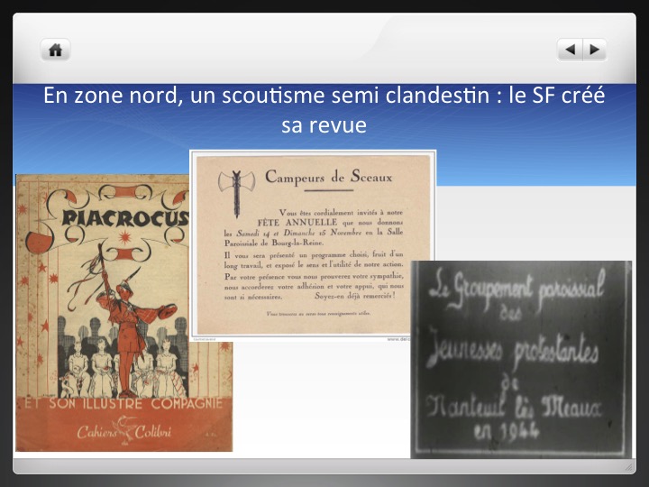 Sur le terrain, Les Campeurs de Sceaux qui n’emploient jamais le mot de scout ou guide donnent leur fête annuelle les 14 et 15 novembre 1942, dissimulent bien peu un groupe SDF qui inclut le bâton des routiers dans la francisque officielle tandis que le groupement paroissial des jeunesses protestantes recouvre les groupes A et B (UCJF et EUF) qui campent au printemps 1944 près de Meaux. Le site du centenaire des EU a mis en ligne le film de ce camp, un document unique !