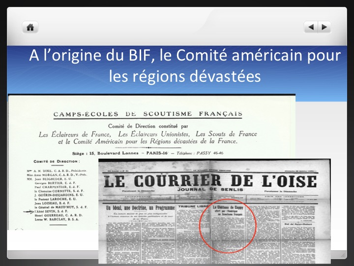 Voilà un sujet d’étonnement. En effet, le BIF naît en 1923 largement grâce à l’action du Comité américain des régions dévastées. Cet organisme fut créé en 1917 par deux jeunes américaines, Anne Murray-Dicke et Anne Morgan, héritière de la banque Morgan. Le CARD joua un rôle essentiel dans la reconstruction de certains cantons du département de l’Aisne de 1917 à 1924 faisant découvrir aux Français aussi bien les bibliothèques circulantes, les infirmières de PMI venant à domicile en voiture et le scoutisme en créant une association, les Éclaireurs de la France dévastée. Le CARD entend organiser le scoutisme en France en fédérant ses associations !