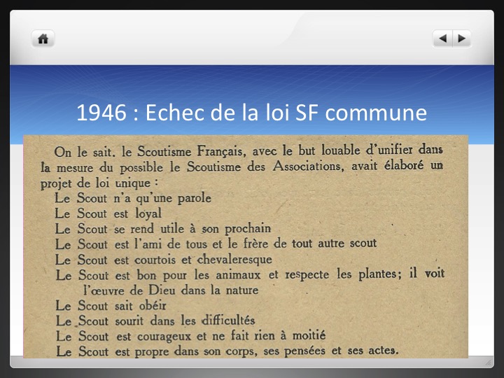Les SDF s’opposent à ce texte à leur AG de décembre 1945 au motif son niveau spirituel ne correspond pas aux buts du scoutisme catholique, qu’il s’écarte trop du texte de BP « que notre loi serre de très près ». On notera que la formule « Le scout sait obéir » sera reprise en 1953 par les Guides de France et en 1964 par les Scouts de France.