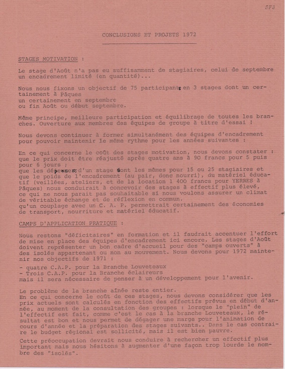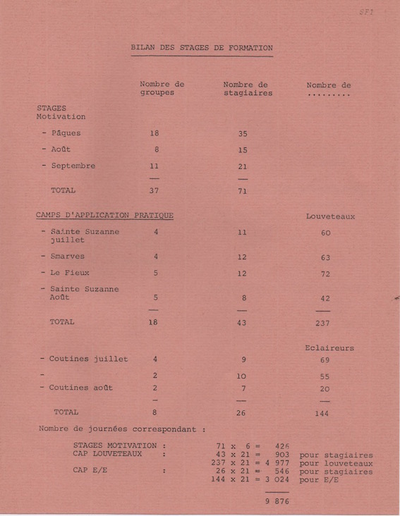 Au cours des années 70, les associations sont responsables de leurs propres dispositifs de formation, la notion de « brevets d’État » n’apparaissant que progressivement avant d’aboutir au BAFA et au BAFD actuels. La période en question, intervenant quelques années après les « événements » de 1968, se traduit par la recherche de formules moins contraignantes que les « camps écoles » traditionnels (camps-écoles préparatoires pour le premier degré, Cappys pour le second degré). La région de Paris a choisi d’expérimenter une formule permettant à la fois un apport « de base » inter-branches, dénommé « stage Motivation » et un apprentissage en commun lors de « camps d’application pratique » où des responsables expérimentés campent avec leur unité à côté d’autres unités. Cette solution combine un apport « théorique » – pourquoi faire du scoutisme EEDF, d’où le terme de « motivation » – et la mise en œuvre vécue – d’où le terme d’ « application pratique ». Il est important de rappeler que c’est le Mouvement, au niveau de sa délégation régionale, qui engage sa responsabilité dans la déclaration des camps (et non les groupes locaux, contrairement à ce que croyaient quelques-uns de leurs responsables).