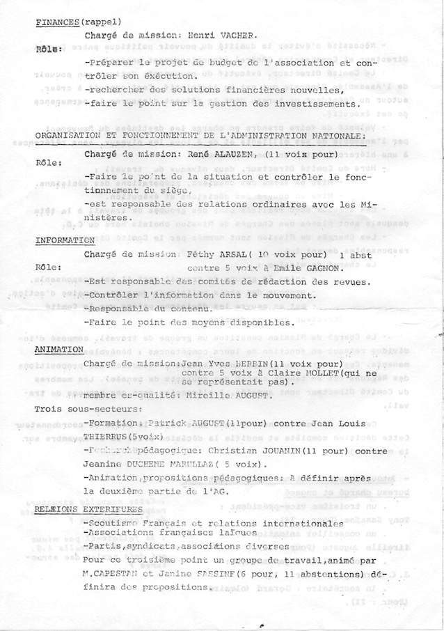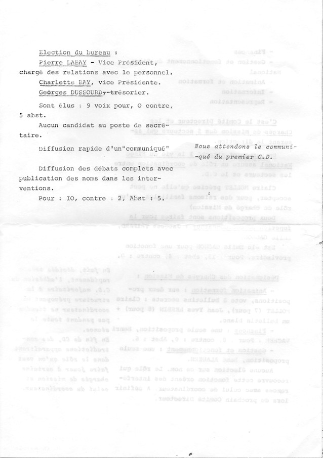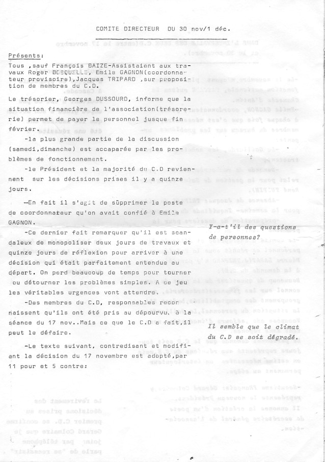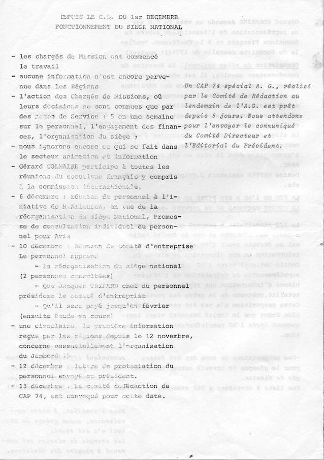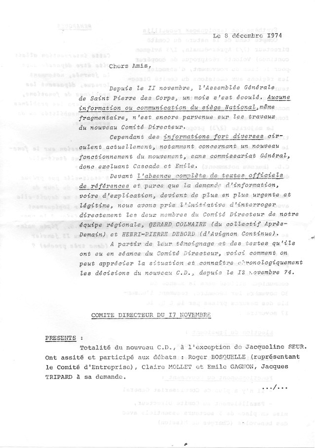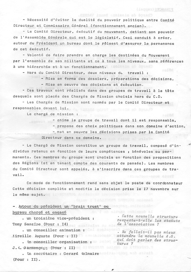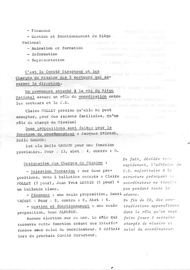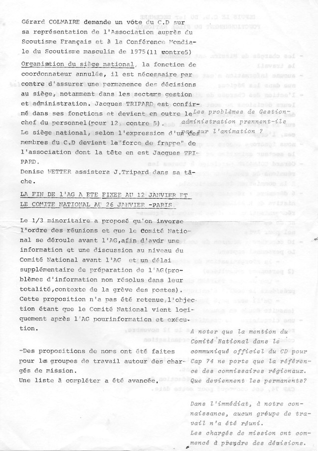 – le deuxième, en banlieue parisienne en janvier 1975, a traité, avec les mêmes participants, les sujets restants… et est revenu sur un certain nombre de décisions du C.D., provoquant la démission du président et du bureau du C.D.