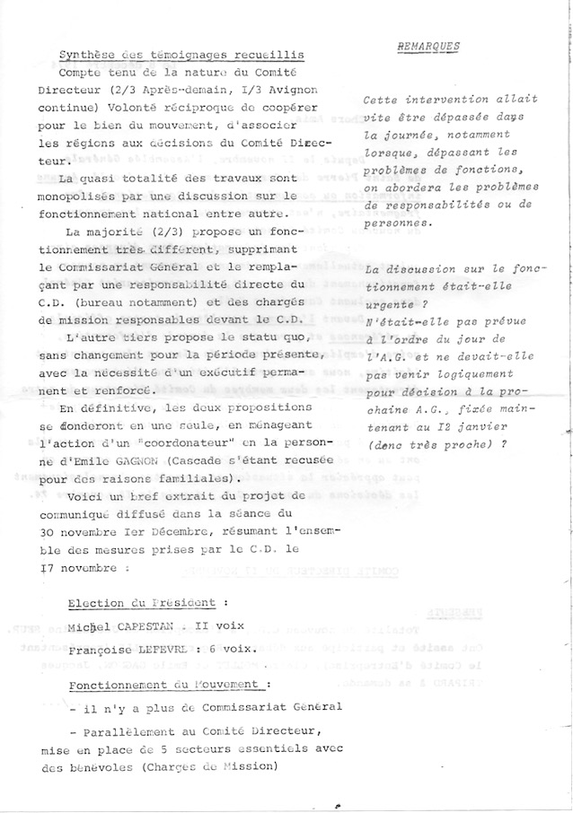 – le premier, à Saint-Pierre des Corps en novembre 1974, a ouvert un certain nombre de débats sur les sujets proposés par la consultation et les assises d’Avignon ; il a procédé à l’élection des nouveaux membres du Comité Directeur, mettant en évidence les rôles majeurs (et les différences d’approche) de deux « tendances » : « Collectif après-demain » et « Avignon continue », dont les prises de position sont présentées par le numéro spéciale de Routes Nouvelles intitulé « Cap 74 ». La tendance « collectif après-demain » étant très majoritaire dans le nouveau C.D. a proposé la mise en place immédiate d’un nouveau mode de fonctionnement national, sous la présidence de Michel Capestan ;