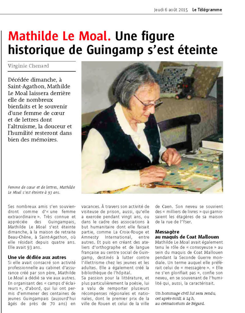 2016 : La presse bretonne rend hommage à une ancienne responsable E.D.F. … militante engagée sur de nombreux fronts depuis la Résistance.