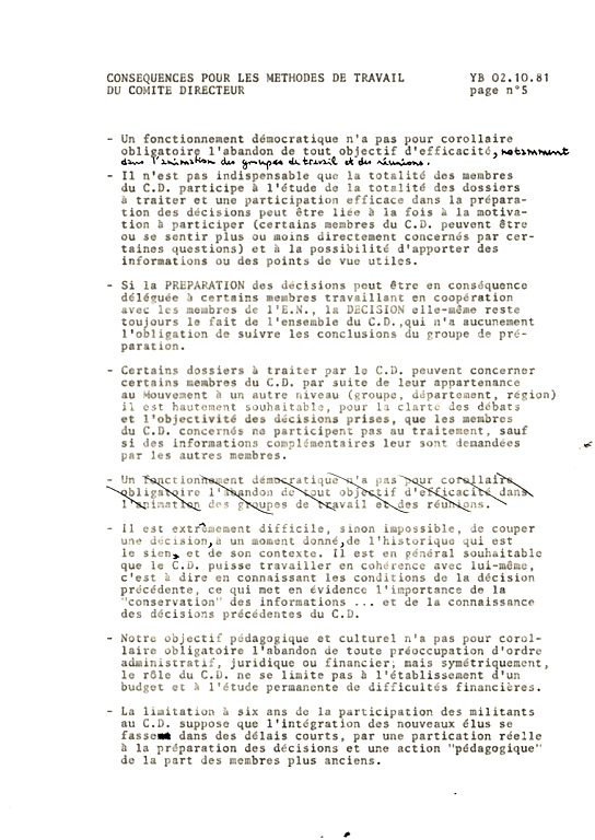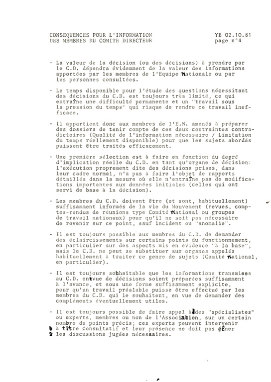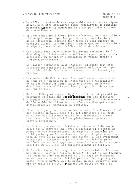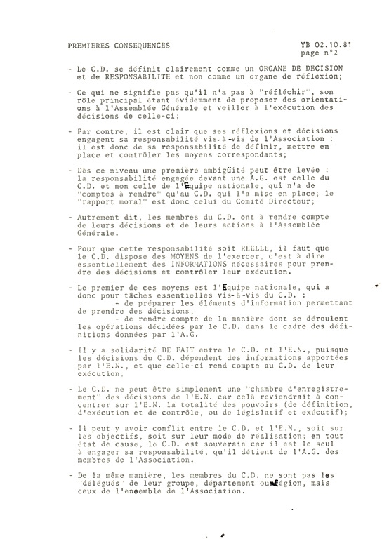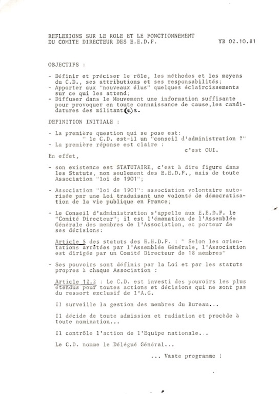 1981 est une année de réflexion, en principe approfondie, pour le Mouvement, à la fois sur ses prises de position (problèmes de société, par exemple les migrants), sa pédagogie (la coéducation) ou son fonctionnement. Le document présenté ici a été préparé par un (tout petit) groupe de réflexion à la demande du délégué général suite à quelques problèmes… Les corrections sont de la main du délégué général.