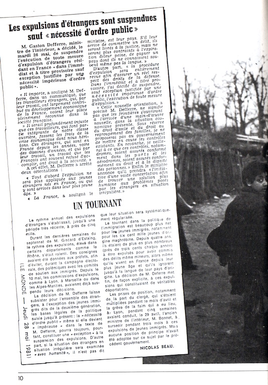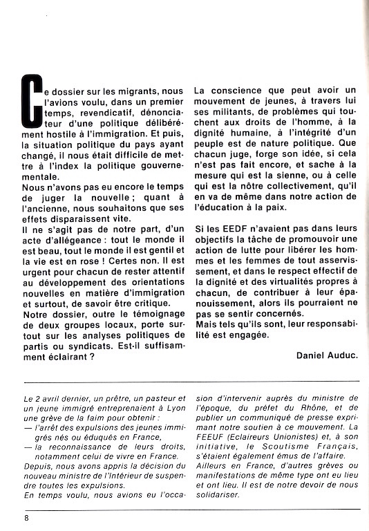 Sous l’impulsion de Daniel Auduc, ancien délégué général, la revue du Mouvement a essayé d’aborder un problème « d’actualité » en 1981, celui des migrants. Nous en avons sélectionné quelques pages. Un chapitre important, non repris ici, résumait les réponses apportées par divers organismes ou partis interrogés dans ce but : le L.C.R., la C.G.T., le Front National, la LICRA, le Club de l’Horloge, le P.C.F., le P.S.. Les « repères » présentés se situent bien en 1981, ils ont peut-être évolué depuis.