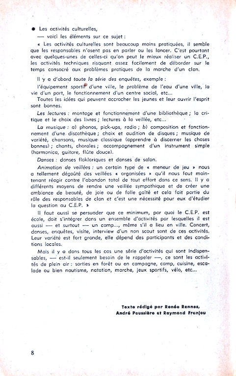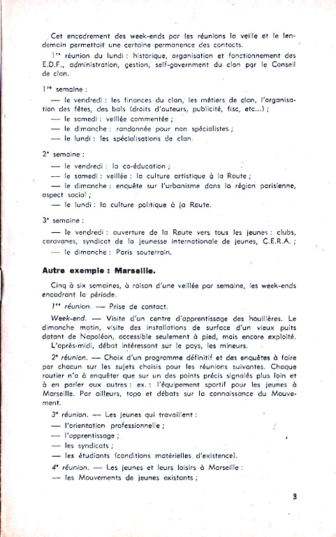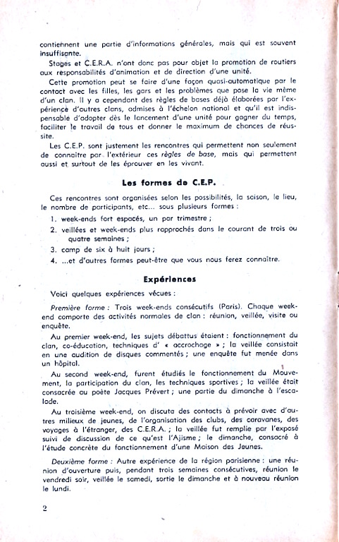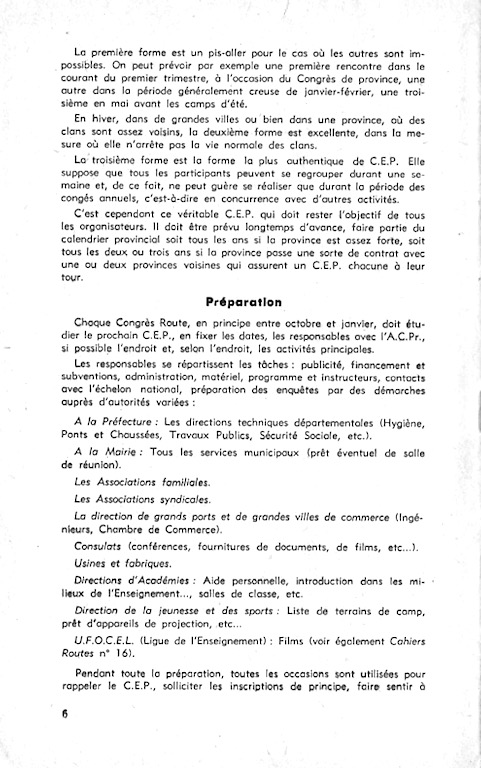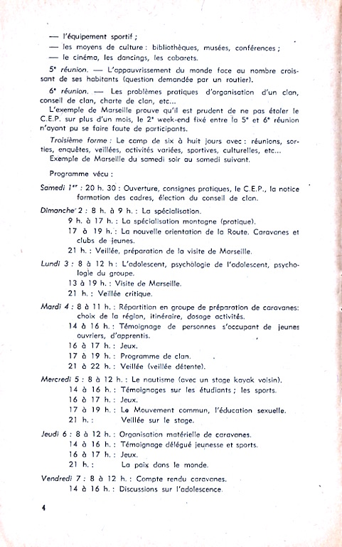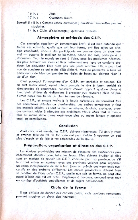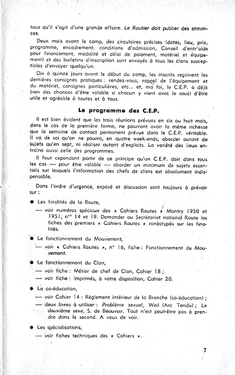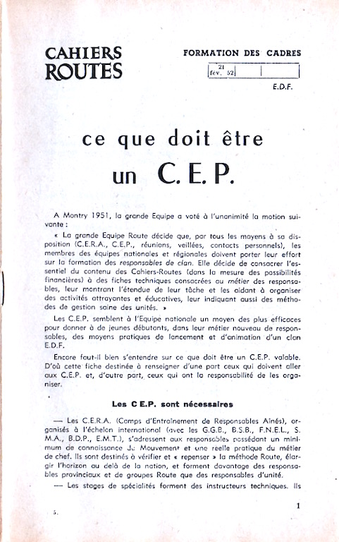 La « grande équipe Route », réunie à Montry, a mené en 1951 une réflexion sur les étapes de la formation pour la branche aînée et en a dégagé une définition actualisée de la première étape de cette formation, en « camp-école préparatoire ». Le résultat en est présenté par un « Cahier Route » en février 1952. Il est intéressant de constater que, si le stage lui-même peut prendre diverses formes, le contenu en est assez précis et aborde un ensemble de sujets concernant aussi bien le fonctionnement des clans que leurs activités.