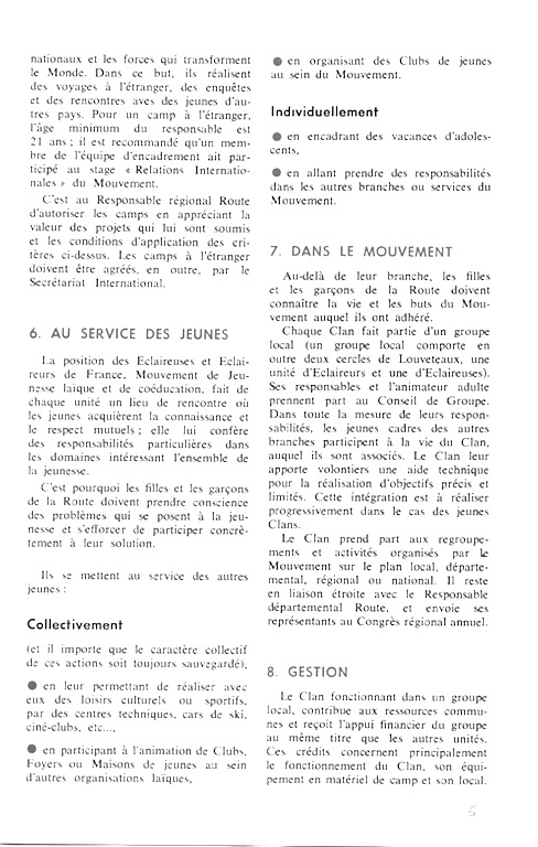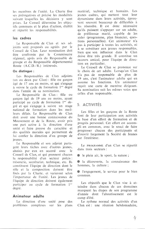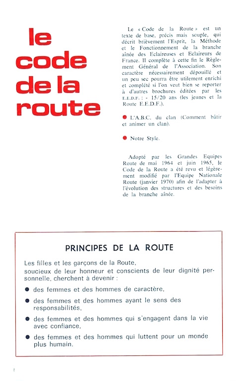 Ce texte « de base », venant en complément du règlement général de l’association, au caractère « nécessairement dépouillé », aborde l’ensemble des sujets concernant l’esprit, la méthode et le fonctionnement de la branche, en accordant une place particulière à la coéducation, à la démocratie, aux techniques… et à la tenue. C’est un véritable tour d’horizon, très complet, qui est proposé aux unités.