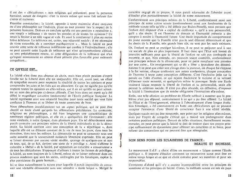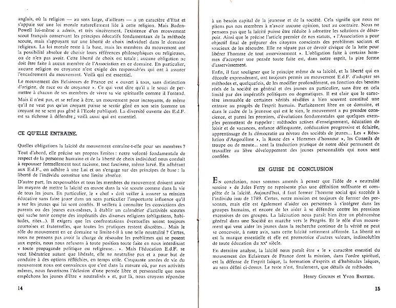 Expérience inoubliable !  L’exposé initial d’Henry Gourin, commissaire national de la branche verte et, dans le « civil », inspecteur primaire, a posé très concrètement le problème de la laïcité du Mouvement, dans une période où le terme lui-même était interprété de diverses manières, après le changement de régime (et de démocratie) apparu en 1958 mais aussi en présence de critiques de la part du scoutisme international. S’il n’a pas posé de véritable problème de fond, cet exposé introductif a été discuté sur un assez grand nombre de points et la rédaction de ses conclusions n’a pas été très facile. C’est Henry Gourin qui, après avoir accepté – avec quelques « améliorations » – mon projet de mise en forme, a demandé que mon nom soit associé au sien dans cette présentation.