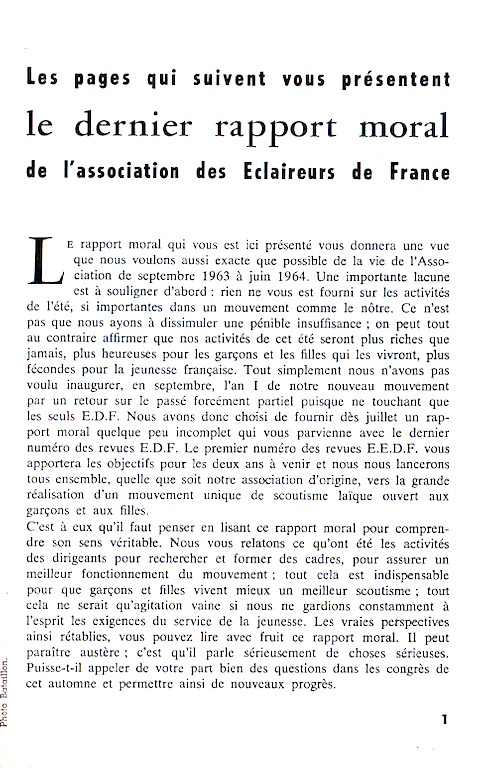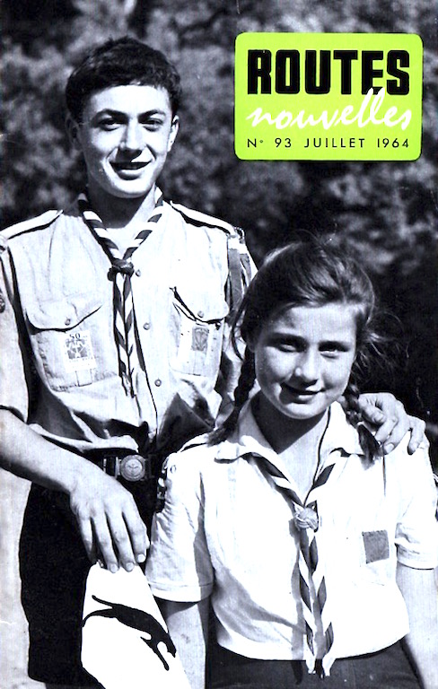 Le numéro 93 de Routes Nouvelles, paru en juillet 1964, présente le dernier « rapport moral » de l’association créée en 1911, trois ans après les manifestations de son Cinquantenaire. Retrouvé dans la collection de Pierre Bonnet, il nous a semblé intéressant car il donne une description très « photographique » de la situation du Mouvement peu de temps avant la création de son successeur. Et il est amusant de constater que sa couverture affirme son choix de la coéducation des filles et des garçons… même si elle a été un tantinet critiquée car le garçon pose une main un peu protectrice sur l’épaule de l’éclaireuse (authentique).