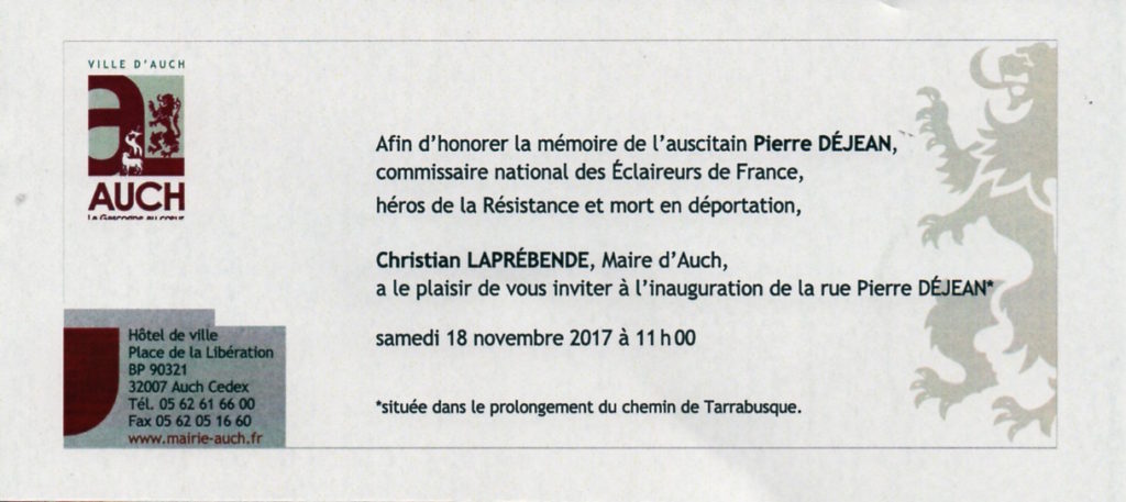2017 : L’inauguration de la rue « Pierre Déjean » à Auch le 18 novembre … une invitation de M. le Maire, une rencontre « inter générations »