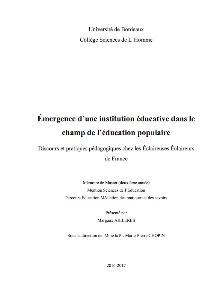 Margaux Aillères, responsable EEDF en région parisienne, à Bois-Colombes, puis membre de l’équipe régionale Aquitaine, a bien voulu nous confier le texte de son mémoire de master (deuxième année) en « sciences de l’éducation » et a bien voulu nous autoriser à en publier ici quelques passages. Un grand merci et un exemple à suivre !