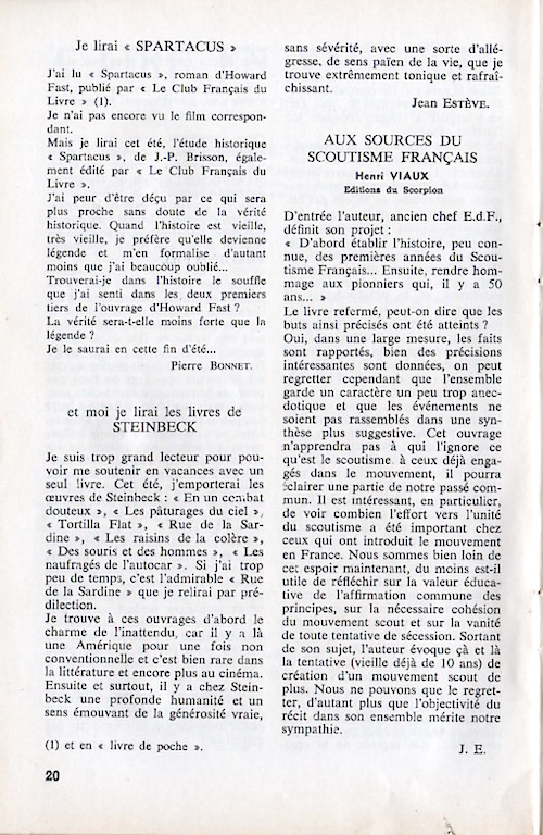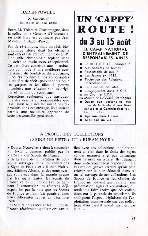 Les membres de l’équipe nationale sont invités à devenir conseillers en lectures de vacances… Jean Estève en profite pour donner son avis sur le livre d’Henri Viaux, dissident des E.D.F., sur les origines du scoutisme français, et Routes Nouvelles s’associe aux commentaires des S.D.F. sur les collections « scoutes ».