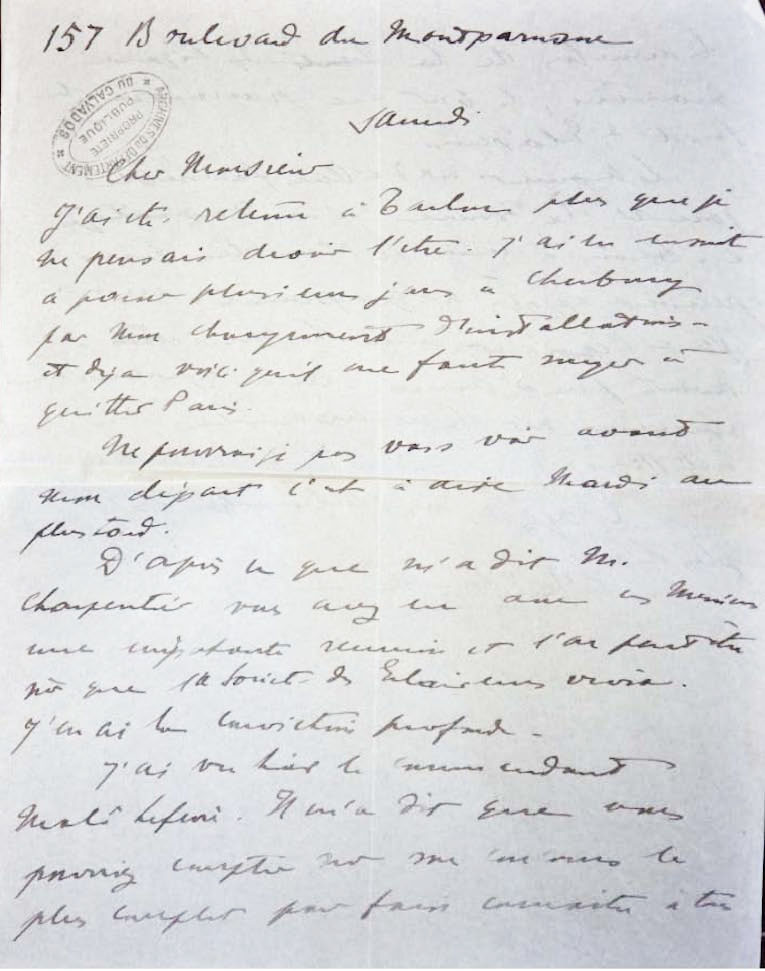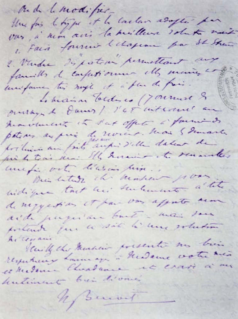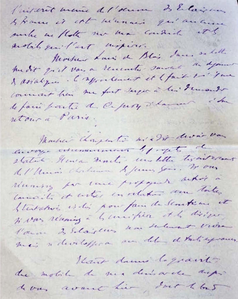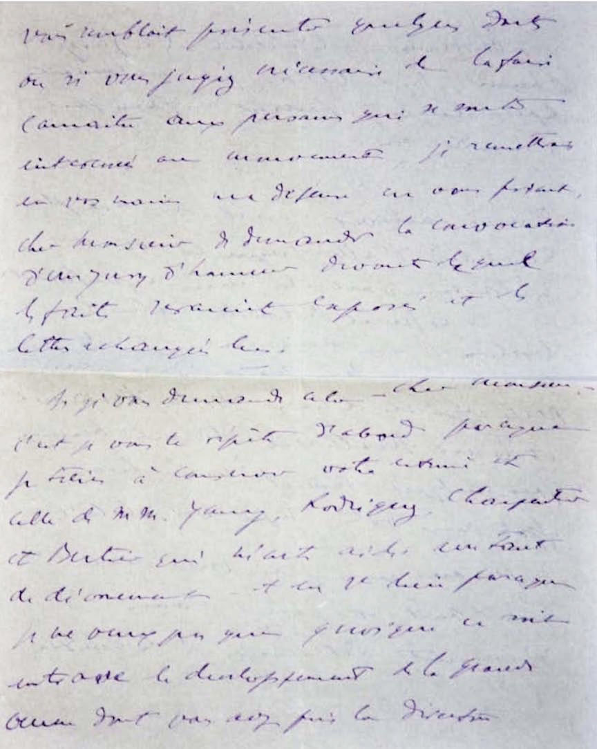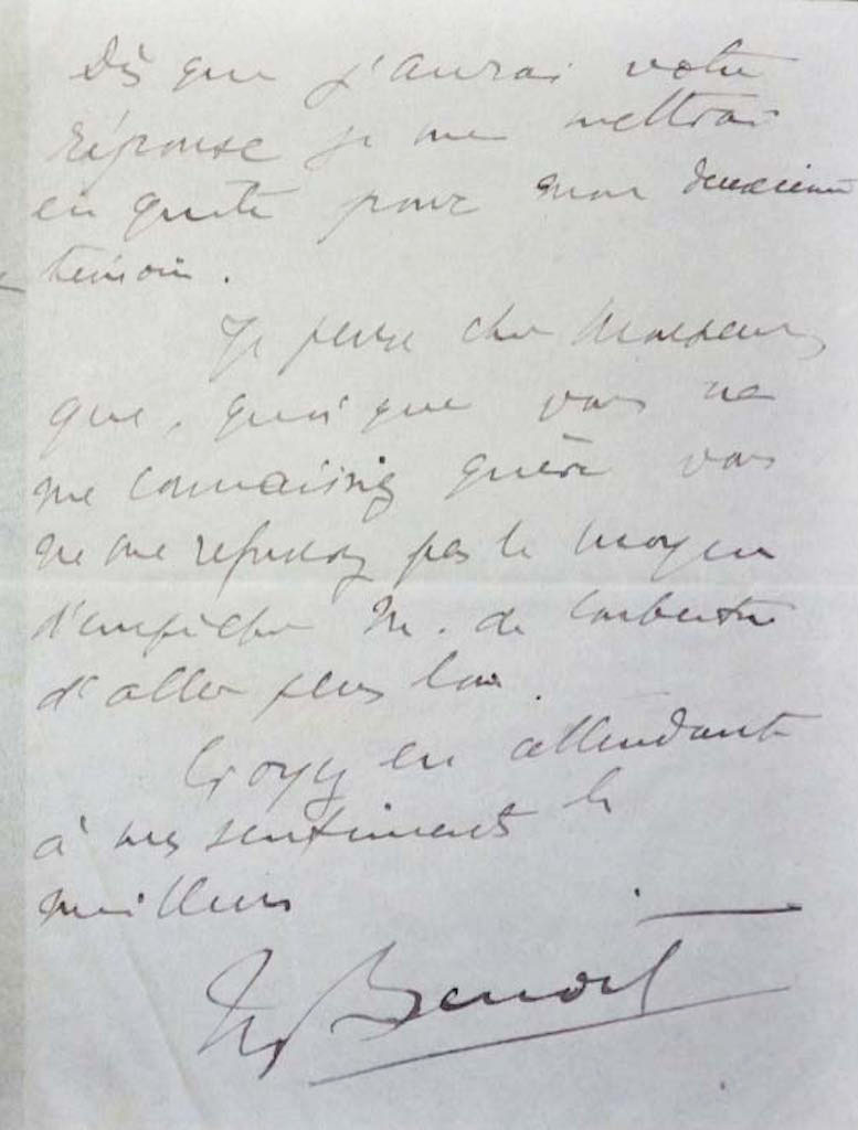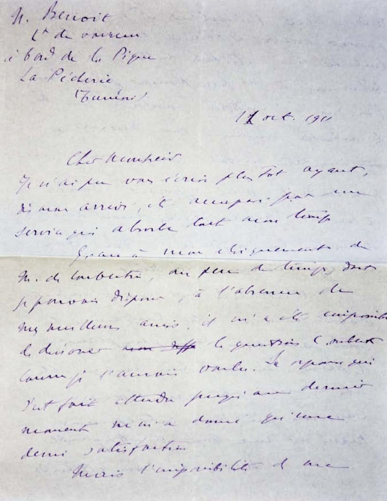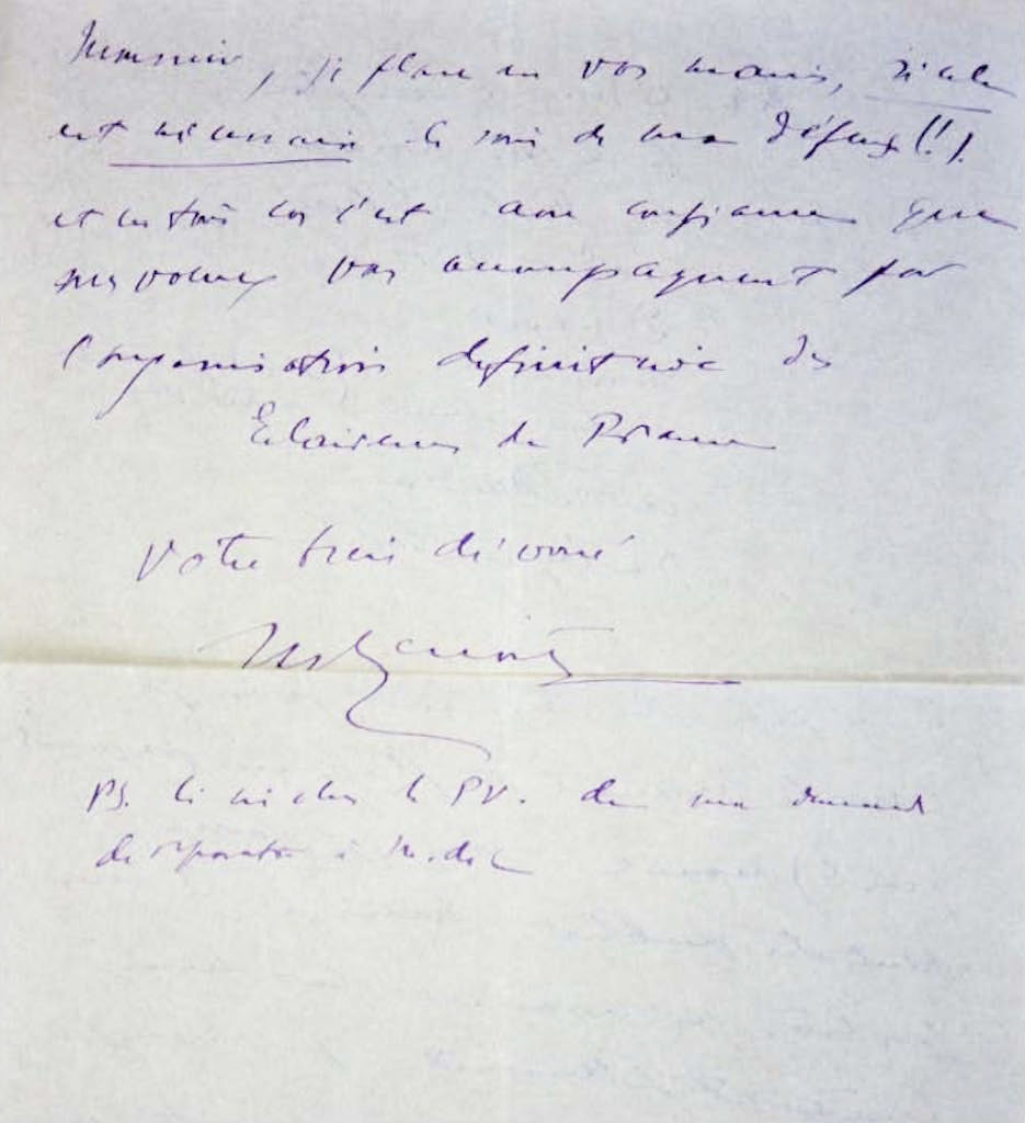 « Je vous retourne d’abord ci-inclus la lettre que vous avez bien voulu me communiquer. J’attendais pour vous écrire et répondre que la nouvelle réunion que M. de Coubertin a voulu faire à la Sorbonne ait eu lieu. M. Bertier et ces autres MM. de vos amis étaient d’avis que nous allions y assister. Quant à moi je m’y suis rendu ayant prévenu nos amis que si un seul mot était dit qui pût impliquer pour vous une idée défavorable je protesterai immédiatement et rétablirai la vérité des faits puisque je considérerais qu’en raison du dévouement dont vous avez fait preuve et de votre éloignement nous avions le devoir moral de ne pas laisser porter atteinte à votre honneur. Cette éventualité ne s’est d’ailleurs pas présentée, M. de Coubertin ayant pris grand soin de ne pas faire la moindre allusion à vous.