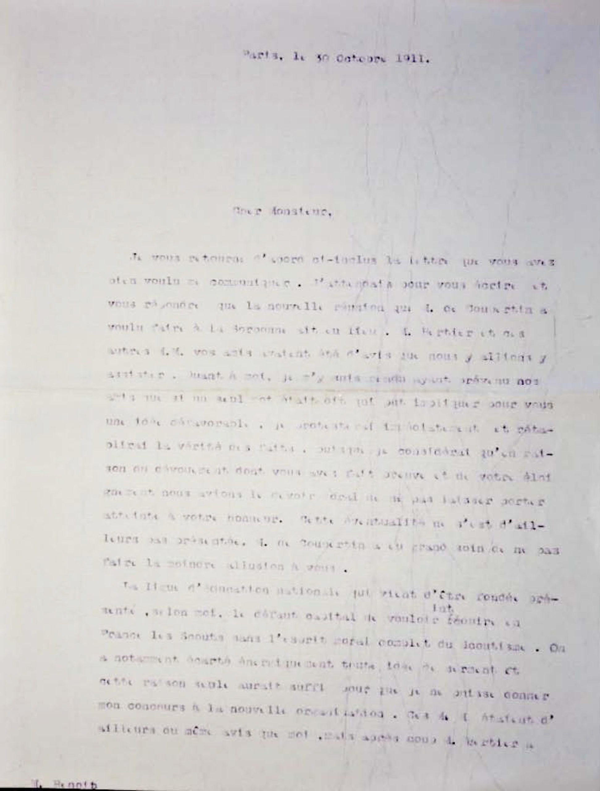 La Ligue d’Éducation Nationale qui vient d’être fondée présente selon moi le défaut capital de vouloir réduire (?) en France les scouts sans l’esprit complet du scoutisme. On a notamment écarté énergiquement toute idée de serment et cette raison seule aurait suffi pour que je ne puisse donner mon concours à la nouvelle organisation. Ces MM. étaient d’accord avec moi mais après coup M. Bertier a été introduit dans le Comité de la nouvelle ligue et son nom a paru dans cette qualité, dans les journaux. Nous allons d’ailleurs avoir jeudi prochain une nouvelle réunion chez M. Charpentier et nous allons voir ce que nous allons faire eu égard à ces diverses circonstances. Mais je ne vous cacherai pas qu’à mon avis tous les tiraillements qui ont eu lieu pour la mise en place d‘une œuvre essentiellement nationale ne peuvent que lui être essentiellement défavorables. »