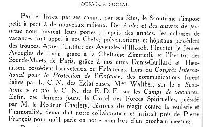 Cette évolution semble s’inscrire dans une volonté de donner au scoutisme un contenu « social », comme le précise un article paru dans « le Chef » en 1934, évoquant l’action du recteur Charlety « contre la veulerie et l’immoralité » dans le cadre du « Cartel des Forces Spirituelles ». Les E.D.F. et la F.F.E. apparaissent comme parties prenantes de cette action, et l’article évoque les « nouveaux milieux », « écoles et œuvres de jeunesse » qui « nous ouvrent leurs portes, en particulier les Instituts d’aveugles et de sourds-muets à côté des préventoriums et hôpitaux. ».
