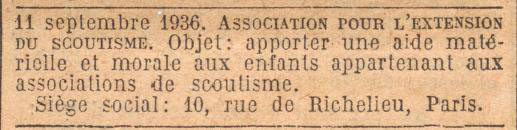 Janik Pikula a retrouvé la création d’une association dédiée en 1936 par la F.F.E., les E.D.F. et les E.U., sans participation des mouvements de scoutisme catholique (qui créeront de leur côté une « association des amis de l’extension », A.N.A.E.).