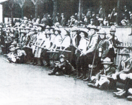 1909, Crystal Palace. B.P. organise le 4 novembre 1909 un Rallye pour le jeune mouvement scout. Mais un choc culturel va se produire. Dans la foule des garçons, un petit groupe de filles arbore fièrement l’uniforme scout : chapeau kaki, foulard et chemise d’uniforme, bâton d’éclaireur. On dit qu’il aurait eu cette remarque : « Mais que viennent faire là ces filles ? »