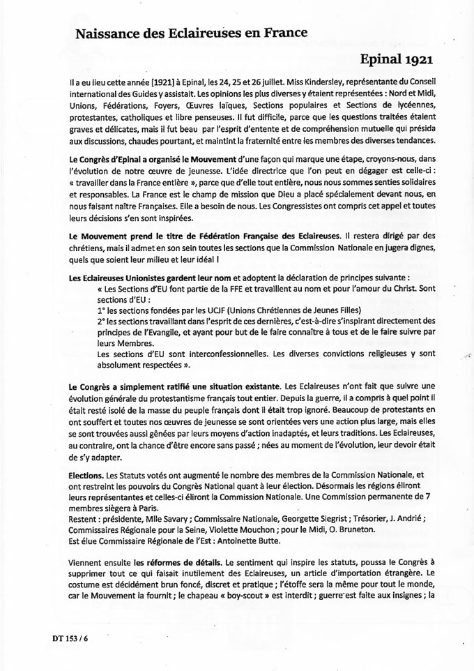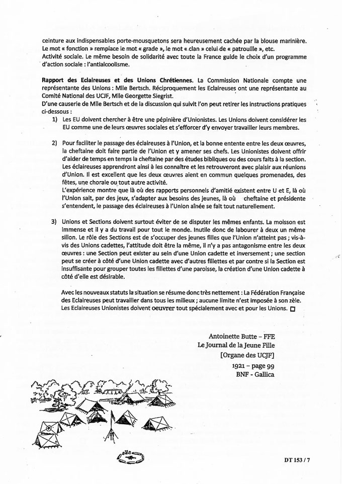 Le D.T., organe – toujours intéressant – de l’A.A.F.F.E. (association des anciennes de la Fédération Française des Éclaireuses), publie en mars 2019 un article d’Antoinette Butte paru en 1921 dans « le journal de la jeune fille », organe des Unions Chrétiennes de Jeunes Filles. Ce document est un complément à ceux déjà parus sur ce sujet, en particulier en ce qui concerne les relations entre la nouvelle association et les U.C.J.F. : « la moisson est immense et il y a du travail pour tout le monde ».