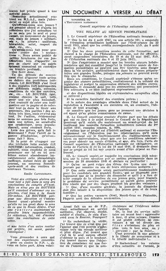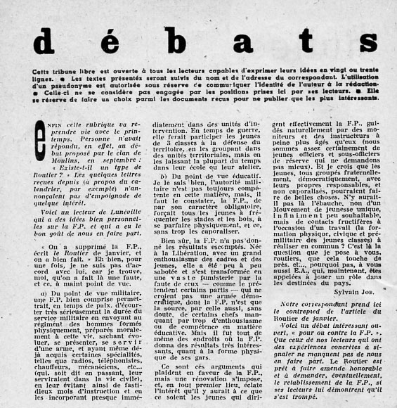 Petit appel : le débat sur la formation prémilitaire fait suite à un article de Pierre Kergomard dans un numéro du Routier (apparemment celui de janvier 1947) dont nous ne disposons pas… Avis de recherche !