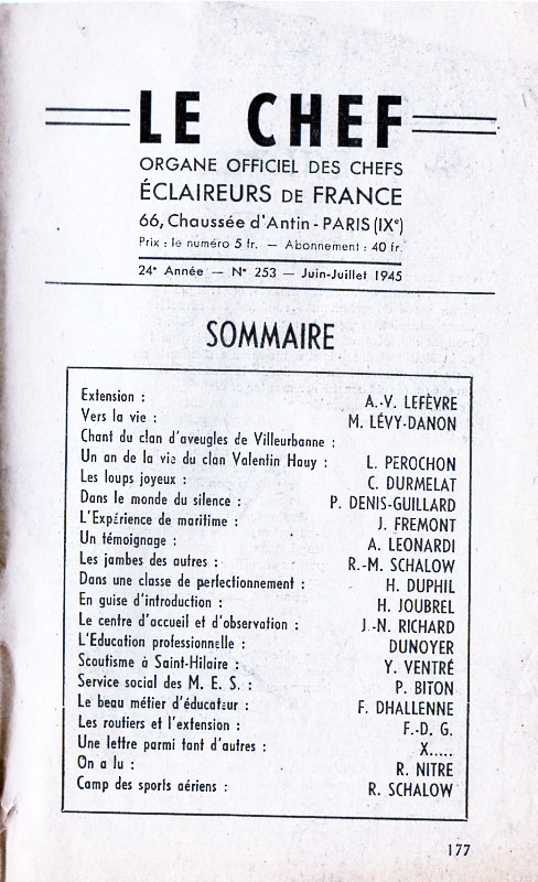 Immédiatement après la Libération, les E.D.F. définissent une véritable « politique » du scoutisme d’extension, à partir de quelques expériences présentées dans ce numéro de la revue, après une introduction par « Vieux Castor », Commissaire général, et « Érable » Lévy-Danon, Commissaire nationale de la branche. La table des matières illustre toute la richesse de ces propositions, en direction des handicapés physiques et sensoriels, mais également en direction des handicapés « sociaux » pour lesquels Henri Joubrel entame une action spécifique. Il est d’ailleurs intéressant de constater qu’il est conseillé d’accueillir ces « enfants en danger moral » dans les groupes locaux.