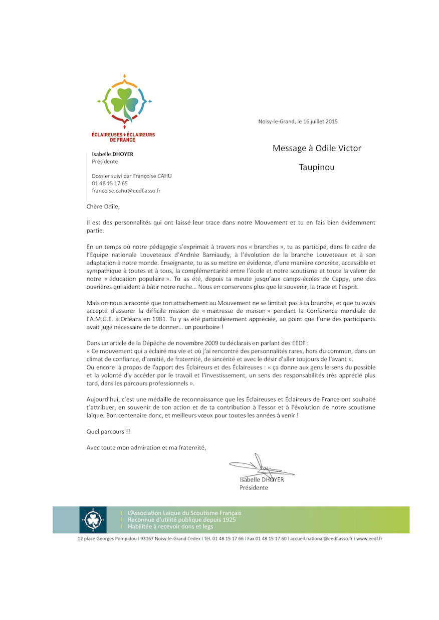 À l’occasion de ce centenaire, lui avait été remise la médaille de reconnaissance du Mouvement attestée par une lettre de la présidente des EEDF que nous rappelons ci-après :