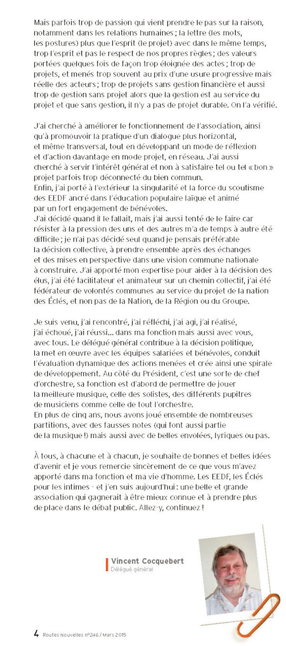 Dans son dernier « édito » de Routes Nouvelles, Vincent évoque ces cinq années passées dans le Mouvement :