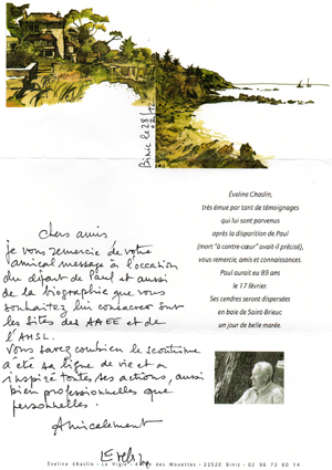N’oublions pas son épouse Evelyne, ancienne responsable E.D.F. (où elle a rencontré « Sloughi » Déjean), qui a accompagné Paul dans toutes ses activités, militantes ou professionnelles.