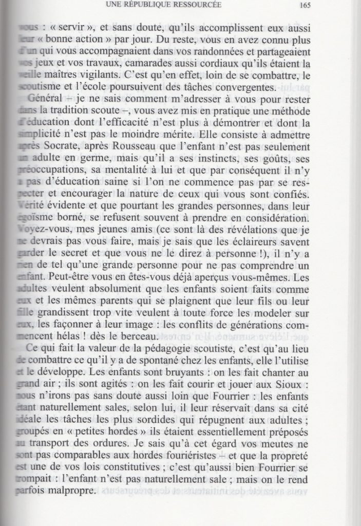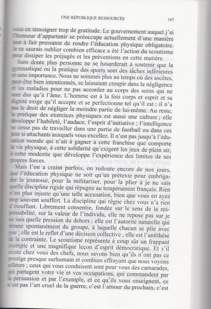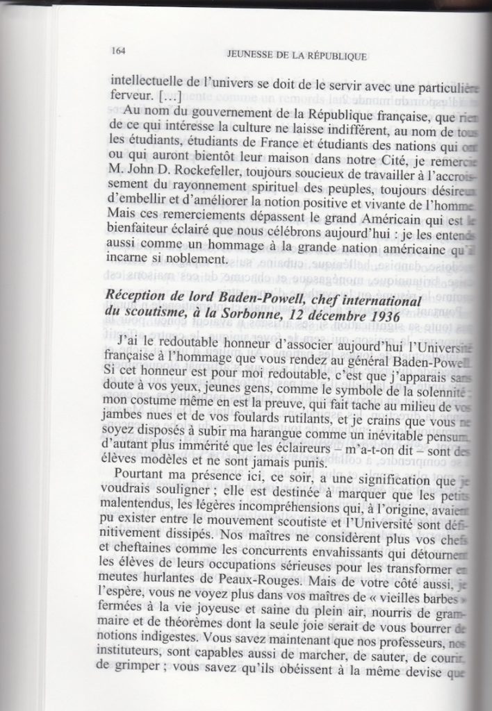 – le discours du 12 décembre 1936 prononcé dans le Grand Amphithéatre de la Sorbonne en l’honneur de Baden Powell à l’occasion des vingt-cinq ans de la naissance du Scoutisme en France ;