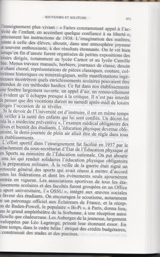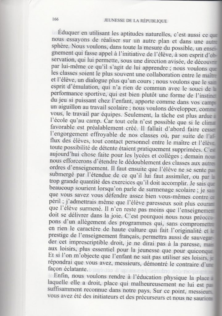 – la réflexion extraite   des mémoires de Jean ZAY écrites depuis sa prison et parues après sa mort sous le titre « Souvenirs et solitude » datée du 14 mars 1942 qui reprend nombre d’innovations pédagogiques et signale le « patronage officiel des Éclaireurs de France » par le Ministre et son ministère.