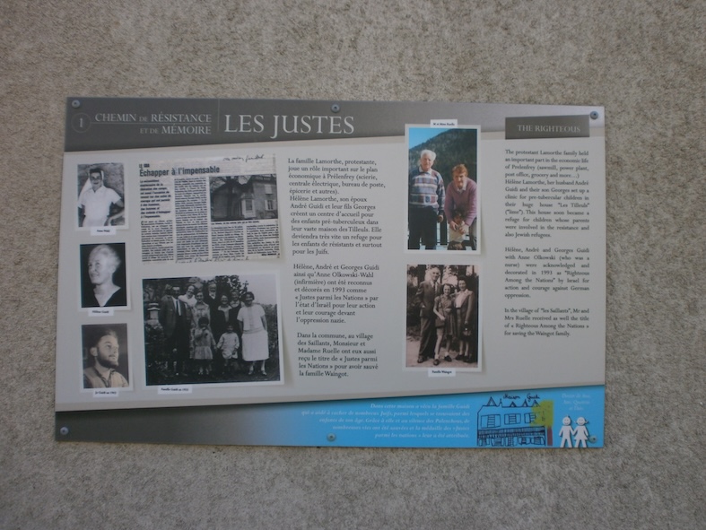 En ce matin du 20 Juillet, sous la conduite de Dominique Lardet, nous avons parcouru le village, nous arrêtant symboliquement face aux lieux où ont été cachés les enfants. C’est un endroit où l’on vit de l’agriculture, du bois. Existait ce préventorium « Les Tilleuls », construit dès 1933, par le menuisier Lamorthe et qui accueillait des enfants prétuberculeux et qui a donc pu cacher enfants et familles. Grâce aux témoignages de ces enfants portés dans des cahiers, on a pu ensuite se rendre compte de ce qui s’est réellement passé.