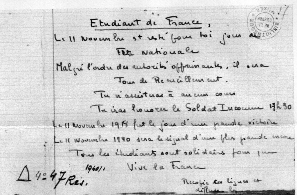 Le 11 novembre 1940 a lieu sur les Champs-Elysées une manifestation de lycéens et d’étudiants. Elle s’achève devant l’Arc de Triomphe de l’Étoile, en commémoration de l’armistice du 11 novembre 1918. Elle rassemble plusieurs milliers de personnes et est durement réprimée par les occupants nazis. Elle est considérée comme un des tout premiers actes publics de résistance à l’occupant en France.